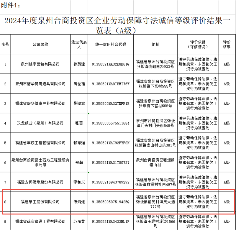 Η επιλογή, που οργανώθηκε από το Γραφείο Ασφάλειας του Λαού της Επιτροπής Διαχείρισης Επενδυτικής Ζώνης Quanzhou Taiwan, αξιολόγησε διεξοδικά βασικούς δείκτες όπως η υπογραφή συμβάσεων εργασίας, οι πληρωμές μισθών, η συμμετοχή στην κοινωνική ασφάλιση, οι κανόνες και κανονισμοί εργασίας, η σύσταση συνδικάτων και η εφαρμογή της δημοκρατικής διαχείρισης. Η Quangong Machinery Co., Ltd πέρασε με επιτυχία όλες τις αξιολογήσεις και έλαβε την υψηλότερη πιστοποίηση A-level, χάρη στο τυποποιημένο και υγιές σύστημα διαχείρισης της απασχόλησης, τους συνεχώς βελτιστοποιημένους μηχανισμούς ευημερίας και προστασίας των εργαζομένων και τις μακροπρόθεσμες προσπάθειες για την οικοδόμηση αρμονικών εργασιακών σχέσεων.