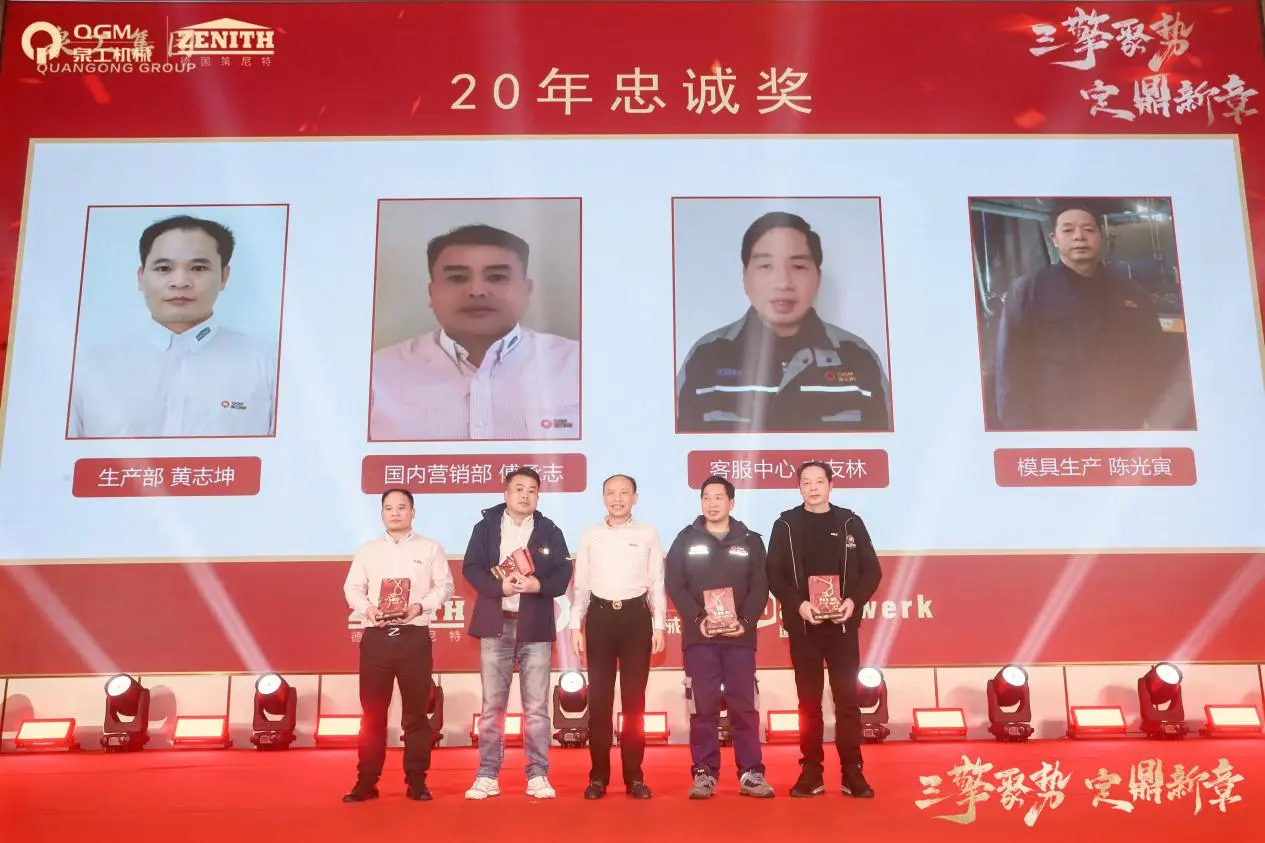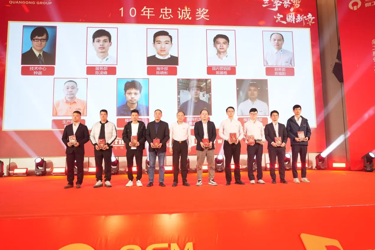 Κατά τη διάρκεια της ετήσιας συνάντησης, πραγματοποιήθηκε επίσης μια μεγάλη τελετή απονομής βραβείων για βραβεία πίστης 10 ετών, 20 ετών και 30 ετών. Μια ομάδα εργαζομένων που πήγαν χέρι-χέρι με την εταιρεία και μεγάλωσαν μαζί ανέβηκαν στη σκηνή, επιδεικνύοντας πλήρως τη σταθερή βάση της σταθερής ανάπτυξης της Quangong Machinery Co., Ltd. και τη διαρκή εταιρική της κουλτούρα.